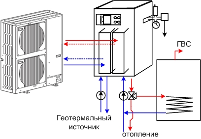 В качестве геотермального источника может выступать горизонтальный контур, вертикальные геозонды, водные ресурсы (водоемы, скважины, сточные воды т.д. )